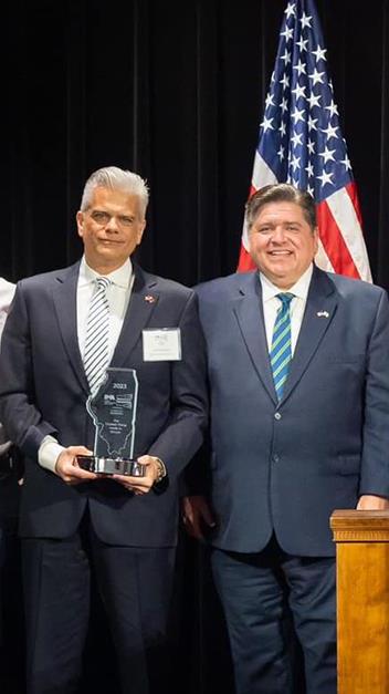 Доктор Джефф Арстром, генеральний директор Ingersoll Machine Tools та губернатор Джей Бі Прітцкер на церемонії нагородження в особняку губернатора в Спрінгфілді. |